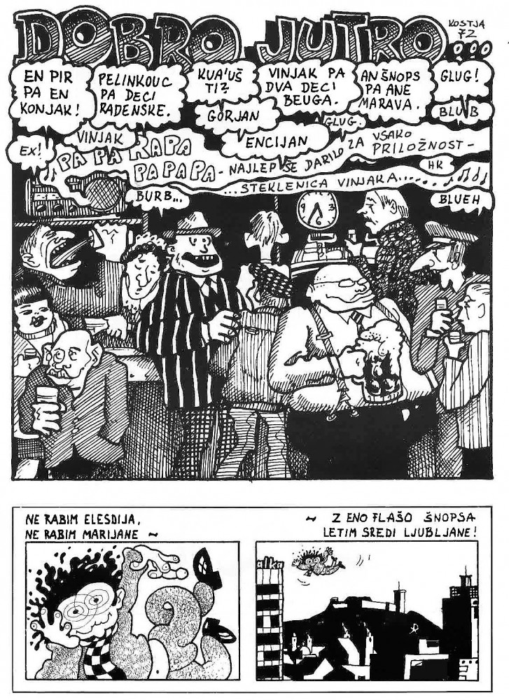 V enostranskem stripu Dobro jutro, objavljenim leta 1972, vidimo pisano druščino. Na steni je ura, ki kaže pol šest (ne vemo ali kaže jutranji ali popoldanski čas). Po oblačilih sodeč gre za različne profile ljudi, od poštarja do poslovneža… Vsem je skupno, da pijejo alkohol. Na isti strani spodaj je pasičen strip s protagonistom, ki govori, da ne rabi »elesdija«, niti »marijane«, in da z eno flašo šnopsa leti sredi Ljubljane.