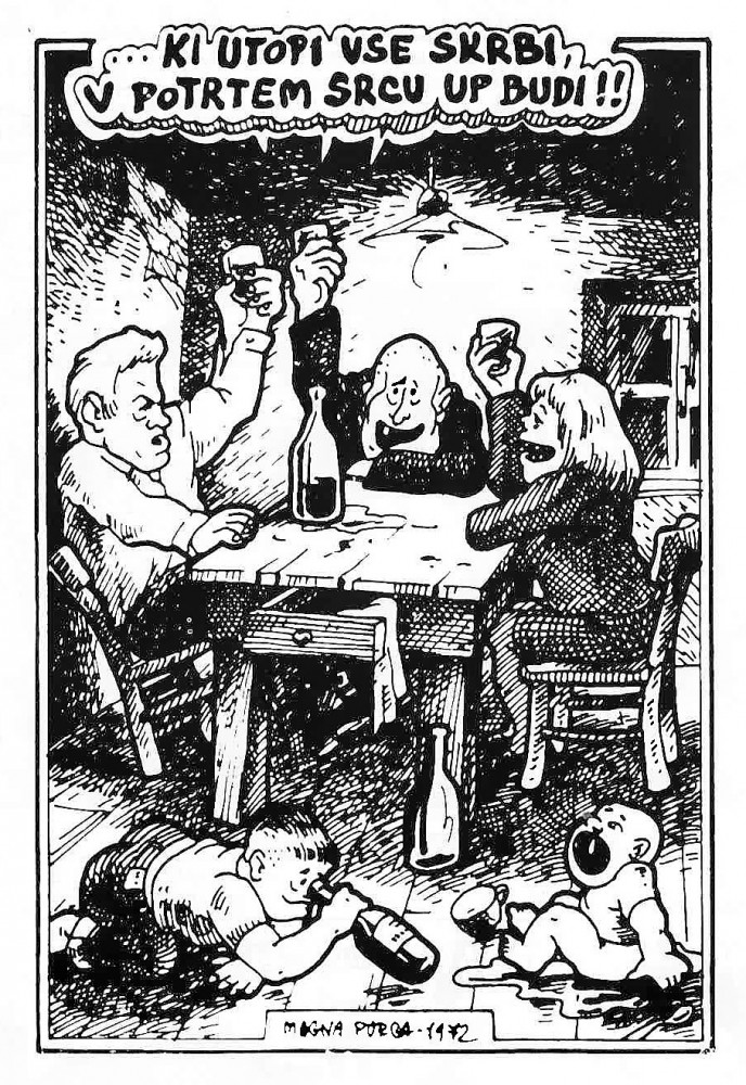 V kafkovsko vzdušje nas posrka Gatnikov naslednji enostranski strip, v oblačku katerega preberemo stavek iz Prešernove Zdravljice: »…ki utopi vse skrbi, v potrtem srcu up budi!!«. Slika prikazuje večgeneracijsko družino pri popivanju. (glej sliko) In prav lahko si predstavljamo, da v sosednji sobi od tiste v stripu, Raskolnikov načrtuje uboj oderuške starke Aljone Ivanovne.
