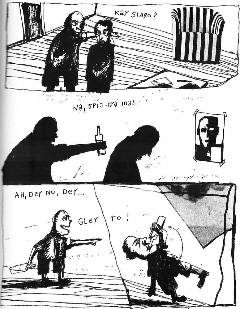 Izzivalen je enostranski strip z naslovom Alkohol in hitra dekonstrukcija njegovega glavnega junaki, ki se izgubi in razblini v nekaj potezah, dokler od njega ne ostanejo zgolj oči, nos in usta ter prazen prostor.