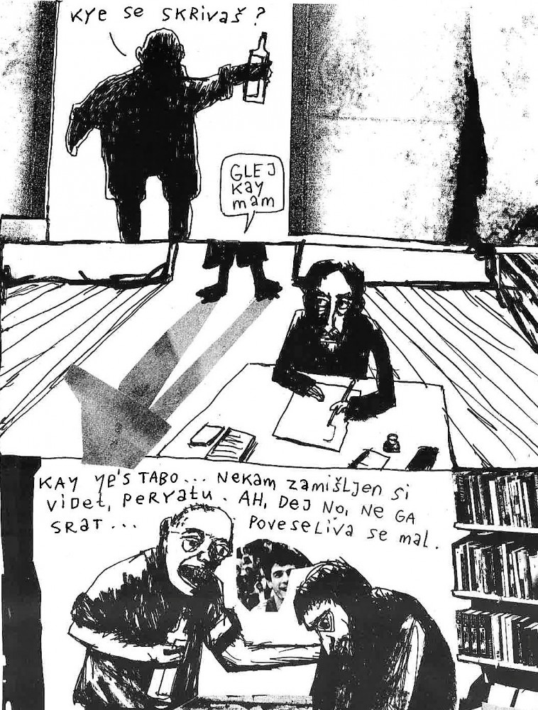 Tokratno druženje končujemo s pesmijo Hansa Magnusa Enzensbergerja, ki jo Andrej izriše v strip in pravi: Brez odsotnih bi ne bilo tu ničesar. Brez beguncev bi ne bilo nič trdnega. Brez pozabljenih nič zanesljivega. Izginuli so pravični. Tako se izgubimo tudi mi.