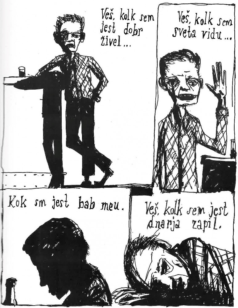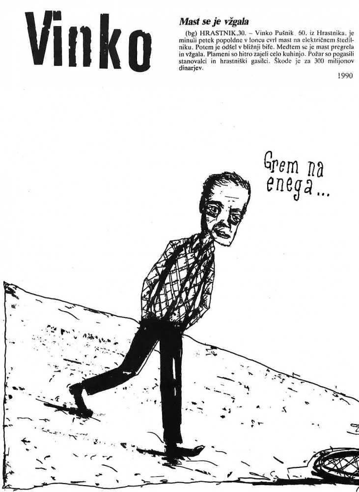 Na straneh črne kronike se je daljnega leta 1990 znašel tudi zapis o Vinku iz Hrastnika, ki je neki petek popoldne v ponvi cvrl mast na električnem štedilniku in jo med tem početjem mahnil v bližnji bife. Seveda se je mast pregrela, plameni zajeli kuhinjo, vse to pa je povzročilo veliko gmotno škodo. Andrej nam predstavi Vinka za šankom v bifeju med natančnim opravljanje mentalne higiene: Dobr sm žvel, imel velik bab in velik gnarja zapil. Do ugotovitev pride med uživanjem alkoholne »ustne vodice«. Izvemo tudi, da je na obali, v Luciji, nekega večera v preteklosti po ulicah strašil pijani dvometraš, oborožen z nožem.